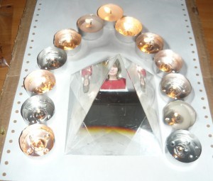 Работа с помощью пирамиды. Когда нужно серьёзно поработать с собой, выход из положения также помогают найти разные методики дистанционного влияния. Одной их эффективнейших в этом ряду является методика работы при помощи пирамиды. Для работы нам потребуются: фотография, четырехгранная пирамида из стекла или хрусталя и 13 свечей. Фотография кладется на стол, головой к себе. На нее ставится пирамида. Теперь, если посмотреть сквозь переднюю стенку пирамиды, на задней стенке, будет отражение фотографии, лежащей на столе. Вокруг пирамиды полукругом ставится 13 свечей, соответствующие 13 основным резонаторам человеческого тела. Одна - прямо по центру. Она соответствует шейному резонатору. Остальные - ровным полукругом, по 6 с каждой стороны. Последние свечи не должны быть расположены ниже края пирамиды. Свечи зажигаются - и вся конфигурация готова к работе. Глядя на отражение в пирамиде, запускается нужная КЭН-частота на всю конфигурацию из свечей и пирамиды. Плазменный столб горящих свечей резонирует с нужной частотой, а пирамида, «закручивая» его, проецирует на модель энергетического тела. Далее - работа идет автономно, и мы можем даже не присутствовать. Однако, рекомендуется периодически (раз в 15-20 минут) “подталкивать” частоту на пирамиде, запуская ее заново. Так можно продолжать несколько часов. Для работы нужно брать равностороннюю пирамиду.