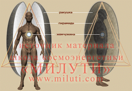 Через несколько месяцев энергетическая точка превращается в огромную дополнительную чакру – жемчужину (см. рис.). Это – очень мощная защита, образованная космическими частотами, сконцентрированная с помощью Золотой Пирамиды. Энергетическая жемчужина не развивается спонтанно – о ней надо знать и помнить. Также, как и Золотая пирамида, жемчужина является защитой только для космоэнергетов.